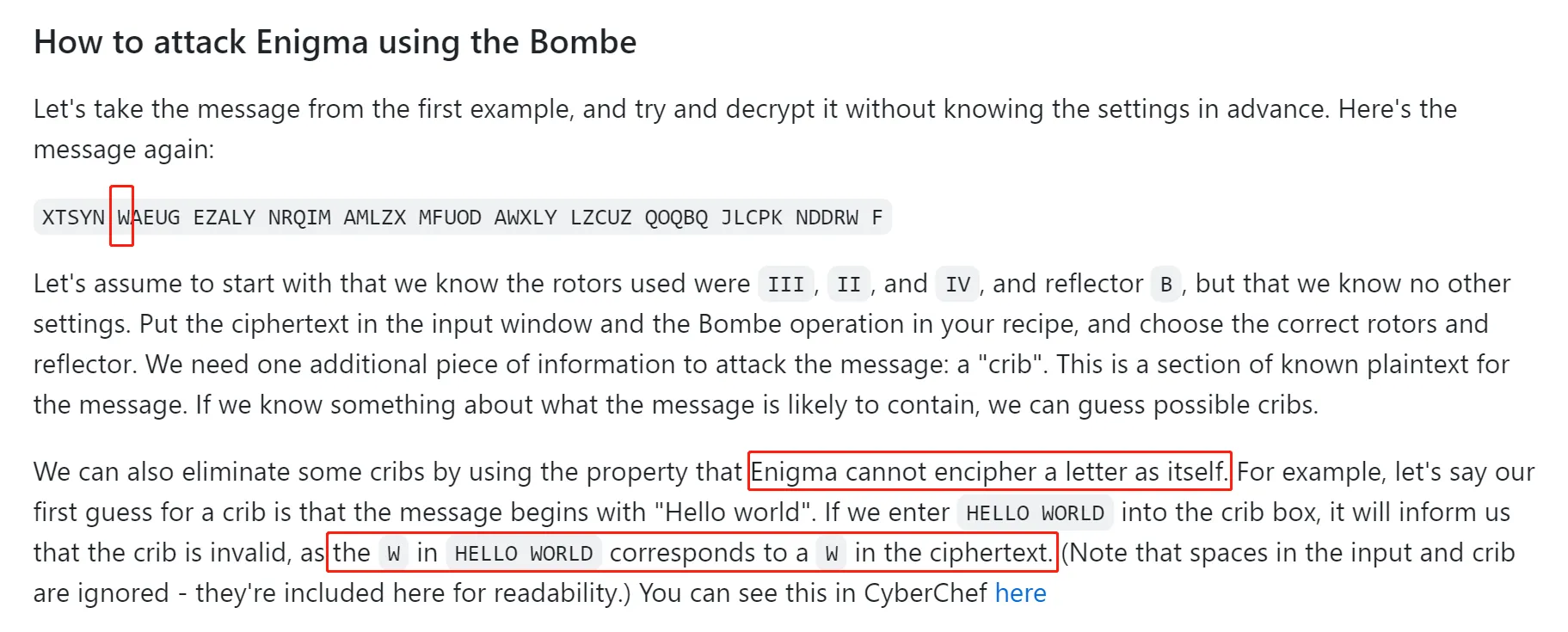 网上搜索 Enigma ,看到 CyberChef 的 wiki ,上面指出原文和密文同一位置上的字母不可能相同。
